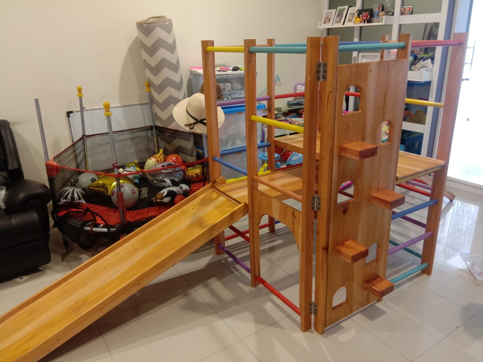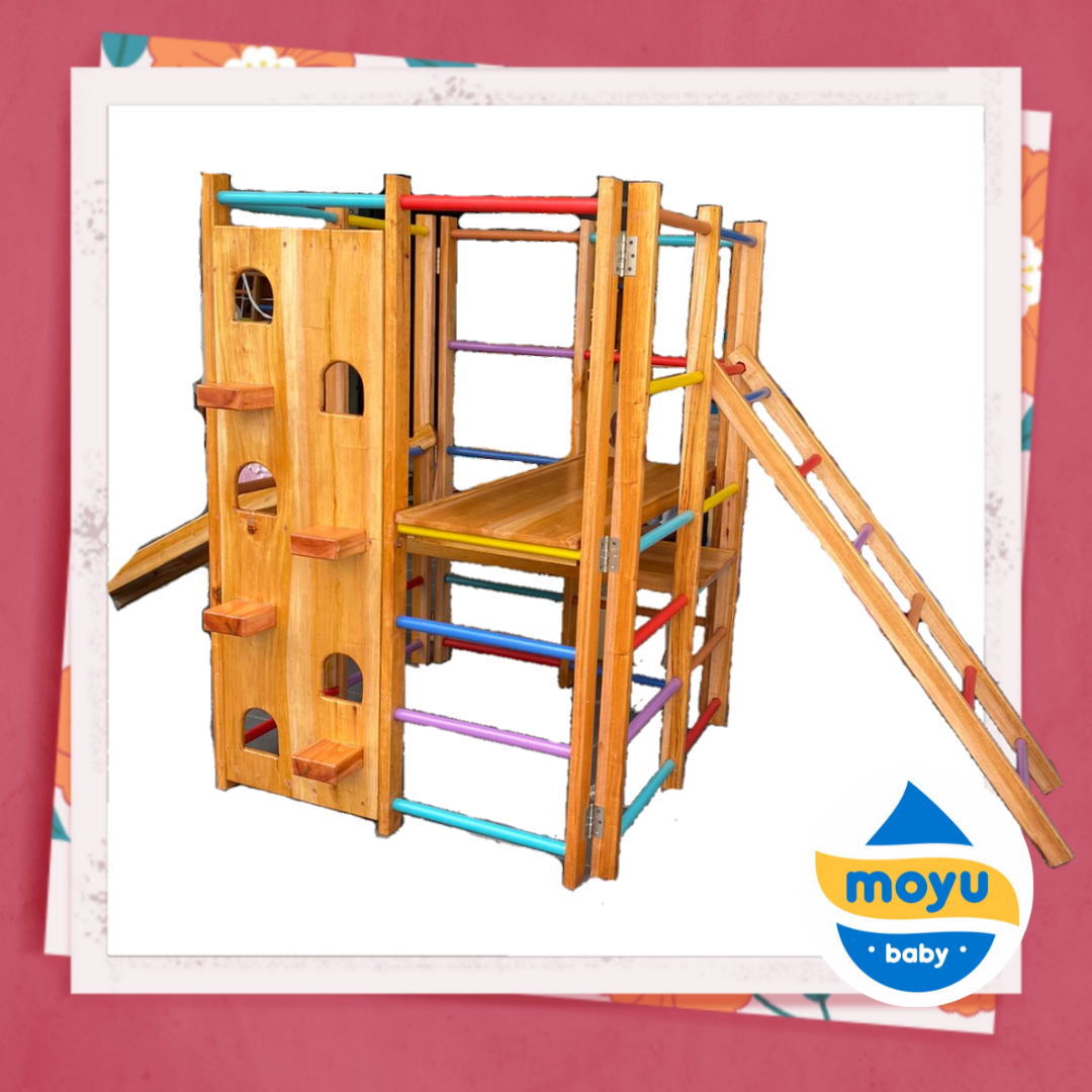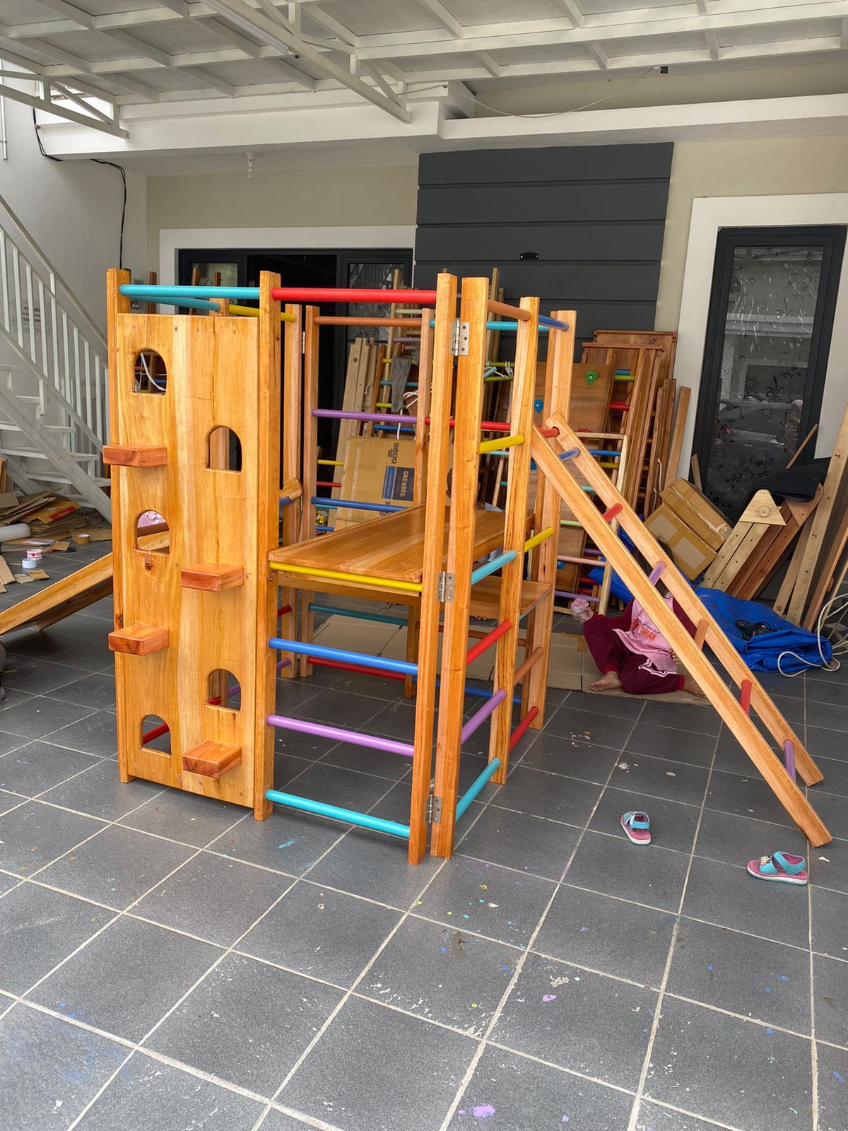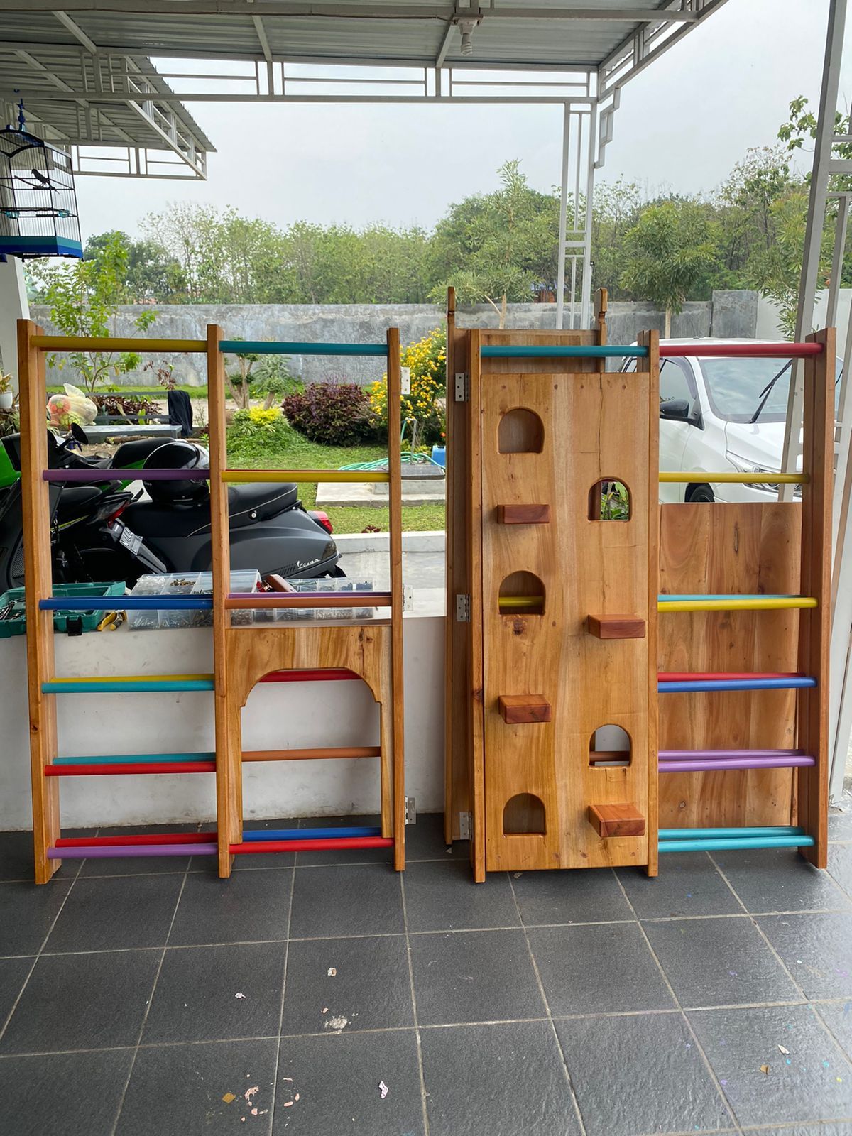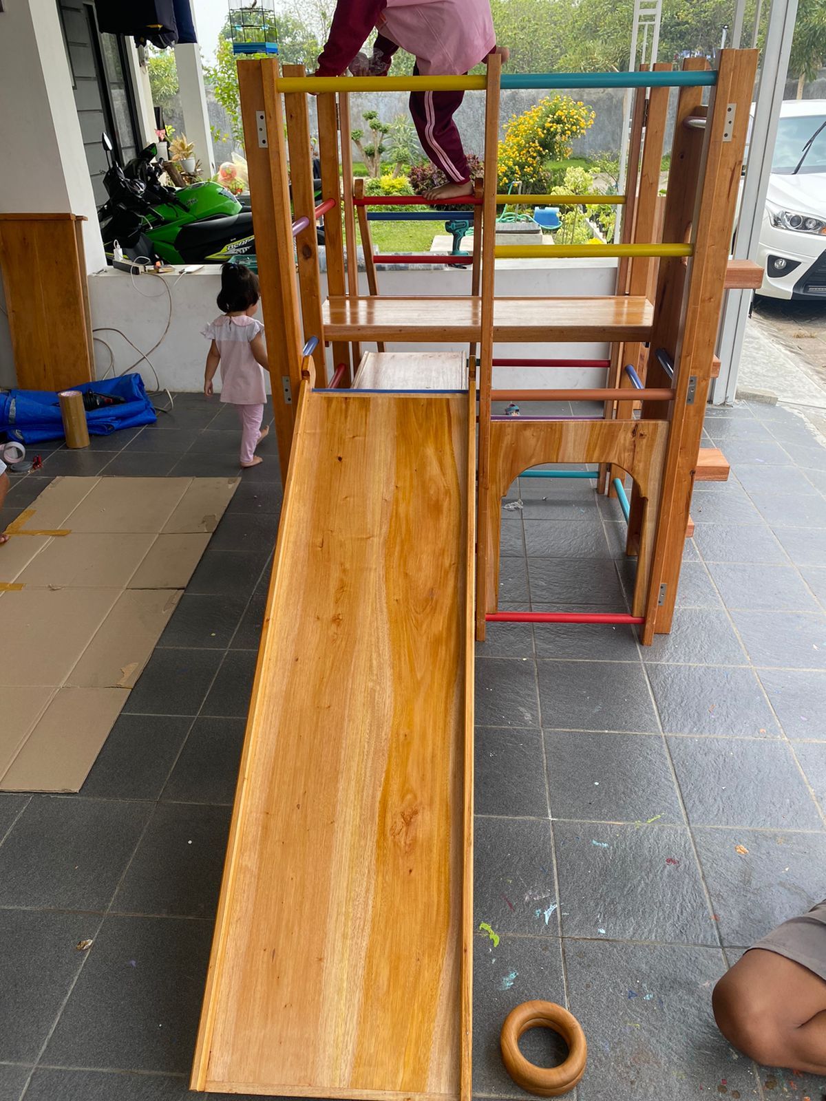 Permainan Brakiasi dengan fitur tangga, panjatan, dan perosotan. Dari bahan Kayu Mahoni.