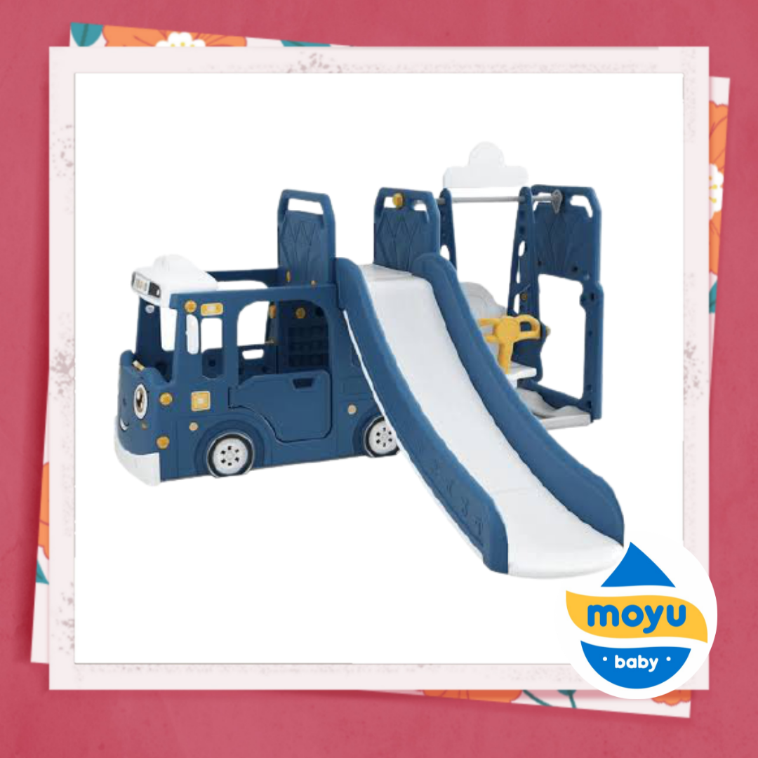 Happy Play Tayo Bus Slide Swing 3in1 – Blue , Mainan perosotan mobilan lucu berbentuk karakter mini Bus berwajah ramah yang dilengkapi set perosotan.